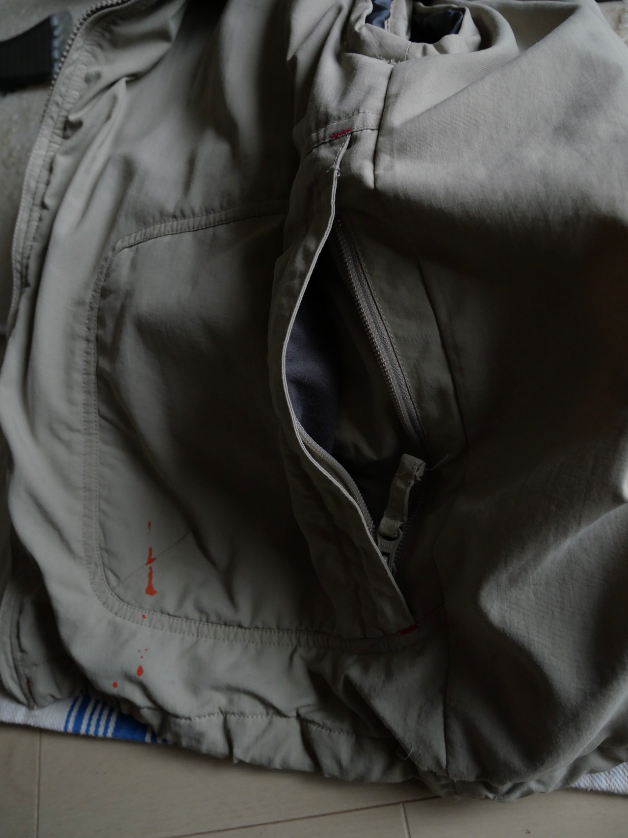 裏地はナイロンとフリース切り替えで脇下左右と裾左右計4つのドローコード付き